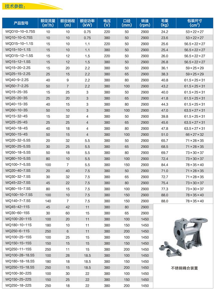 WQ(D)-S全不銹鋼排污泵是上海意嘉泵業(yè)制造有限公司生產(chǎn)的主打產(chǎn)品產(chǎn)品之一,采用全不銹鋼精密鑄造、耐高溫電纜、密封圈、機(jī)械密封和NSK日本進(jìn)口高溫軸承來解決液體溫度高達(dá)120℃介質(zhì)的排放問題??筛鶕?jù)用戶要求定制帶攪勻及切割裝置。