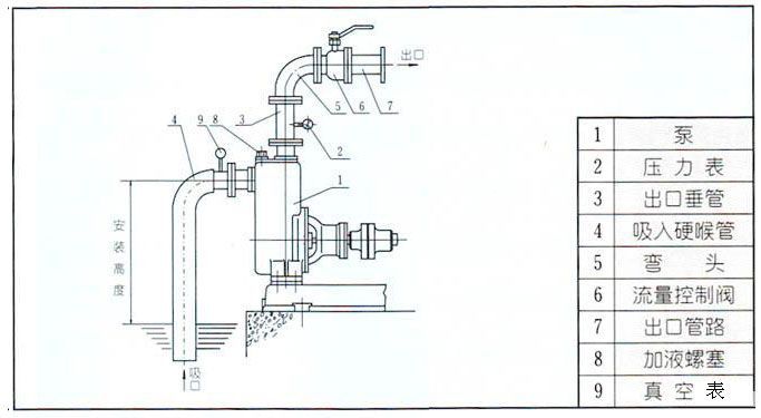 a. 吸入口的安裝高度盡量不超過5米,在條件許可時(shí),吸入口的安裝高度應(yīng)盡可能地低于油庫最低儲(chǔ)油面.并盡量縮短吸入管的長度,少裝彎頭.這樣有利于縮短自吸吋間.提高掃艙功能。