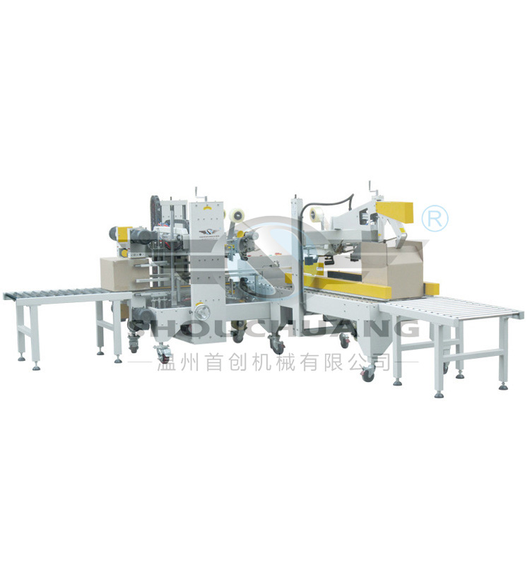 角邊封箱機則負責完成四角邊的紙箱膠帶封箱,該封箱機性能穩定、品質可靠、封箱效率高、適用性強、使用壽命長;采用即貼膠帶封口,經濟快速、調整方便。兩臺機器配合起來即完成工字形封箱。