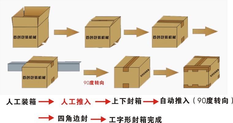 ④適用多種紙箱自動折蓋工字型封箱,紙箱上下四個角邊同時自動封口、撫平,快速、平穩(wěn),也可與自動化包裝流水線配套使用。