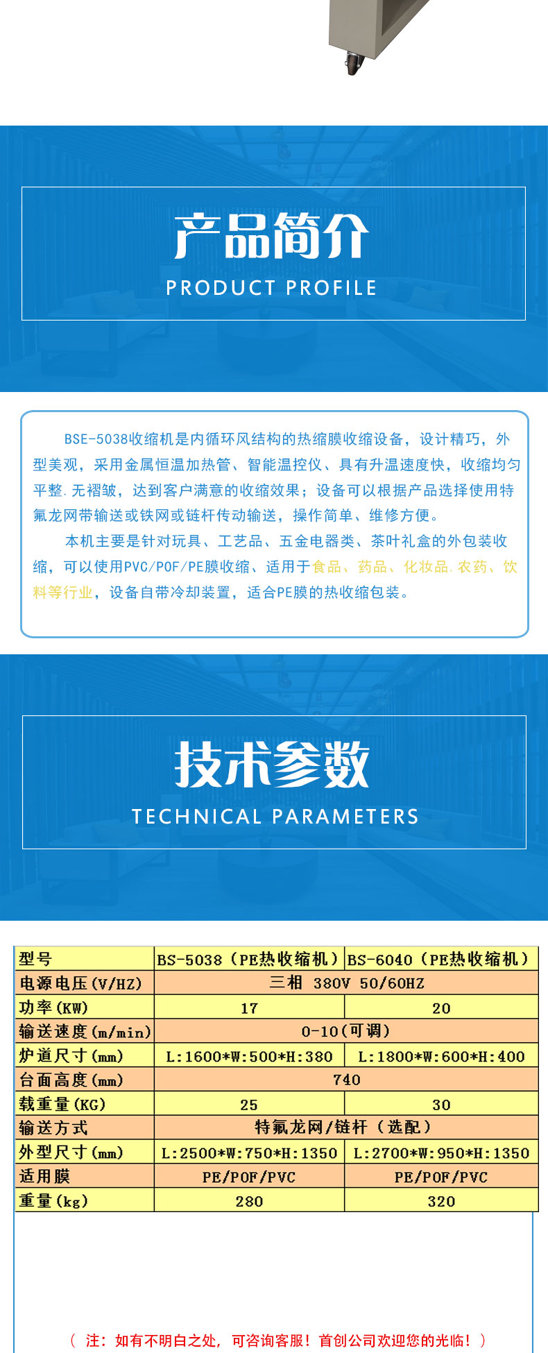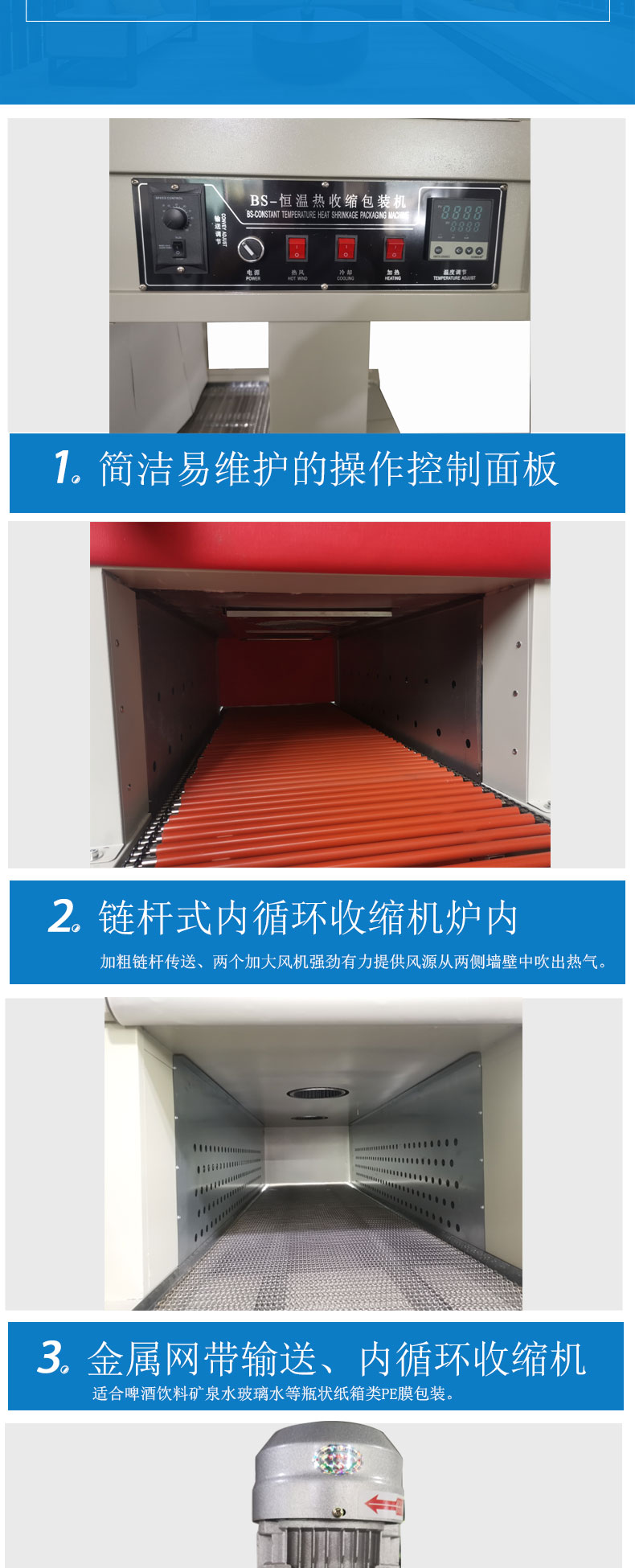 BS-60 series shrink tunnel adopts PE shrink film packaging design for large and heavy objects. Even the large packing object can be shrunken in a short time. The products after packing will be guaranteed in quality with clean appearance and compact in structure, which will be much easier for stacking and long-distance transportation. Variety of shrinking films, including PE, PVC, POF etc are applicable.