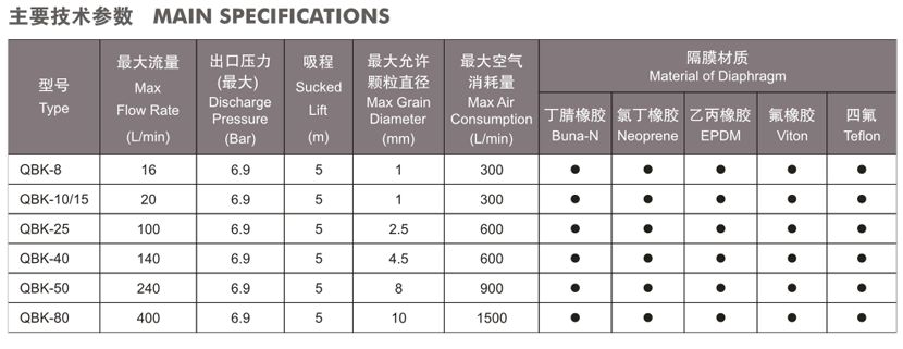 QBK第三代氣動(dòng)隔膜泵主要技術(shù)參數(shù):