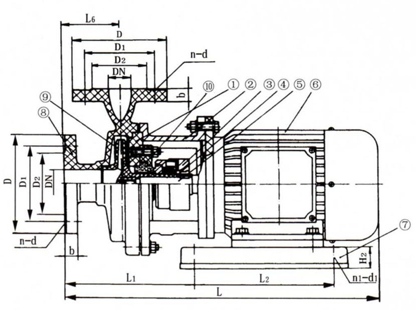 1 泵蓋 2 聯(lián)接架 3 機(jī)械密封 4 軸套 5 軸承 6 電機(jī) 7 底座 8 泵體 9 葉輪 10 密封壓蓋